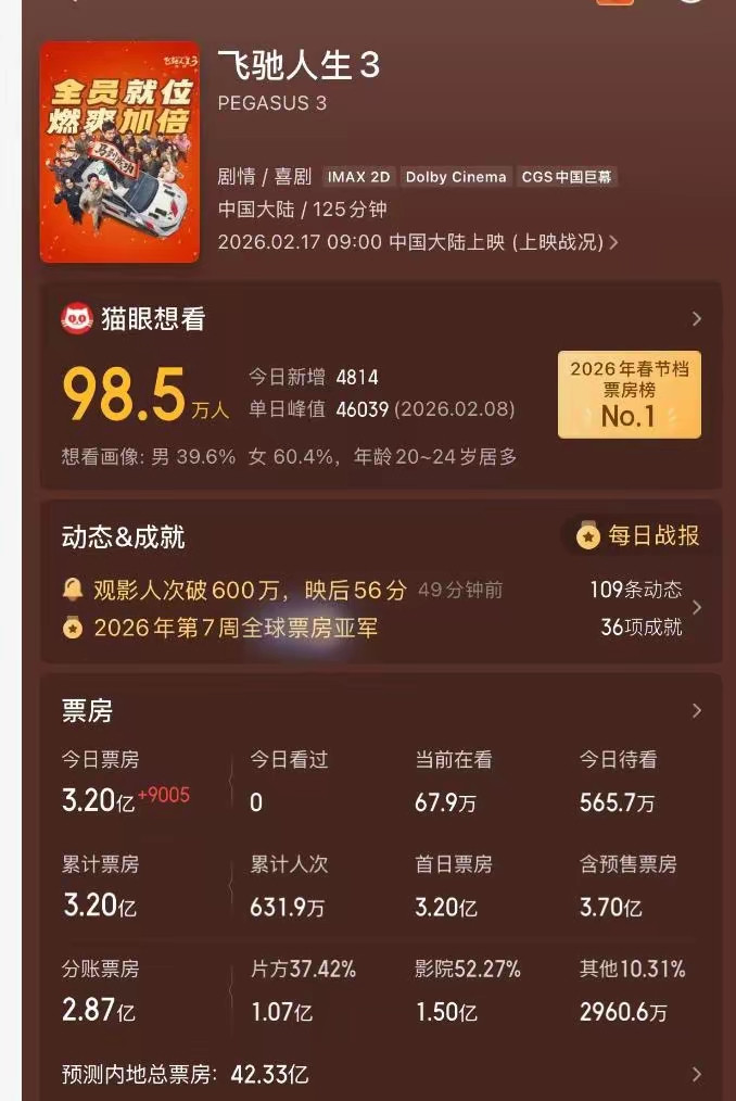 《飞驰人生3》扛起档期票房核心数据,影片由韩寒执导,沈腾担任主演,院线排片占比维持在30%,影片上映两小时票房数据突破3亿,当日票房占比达到48%,远超排片份额,行业端给出的最终票房预测数值定格在42亿,档期冠军席位基本确定归属。